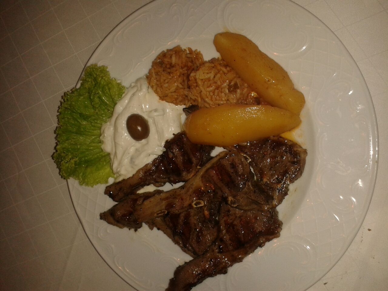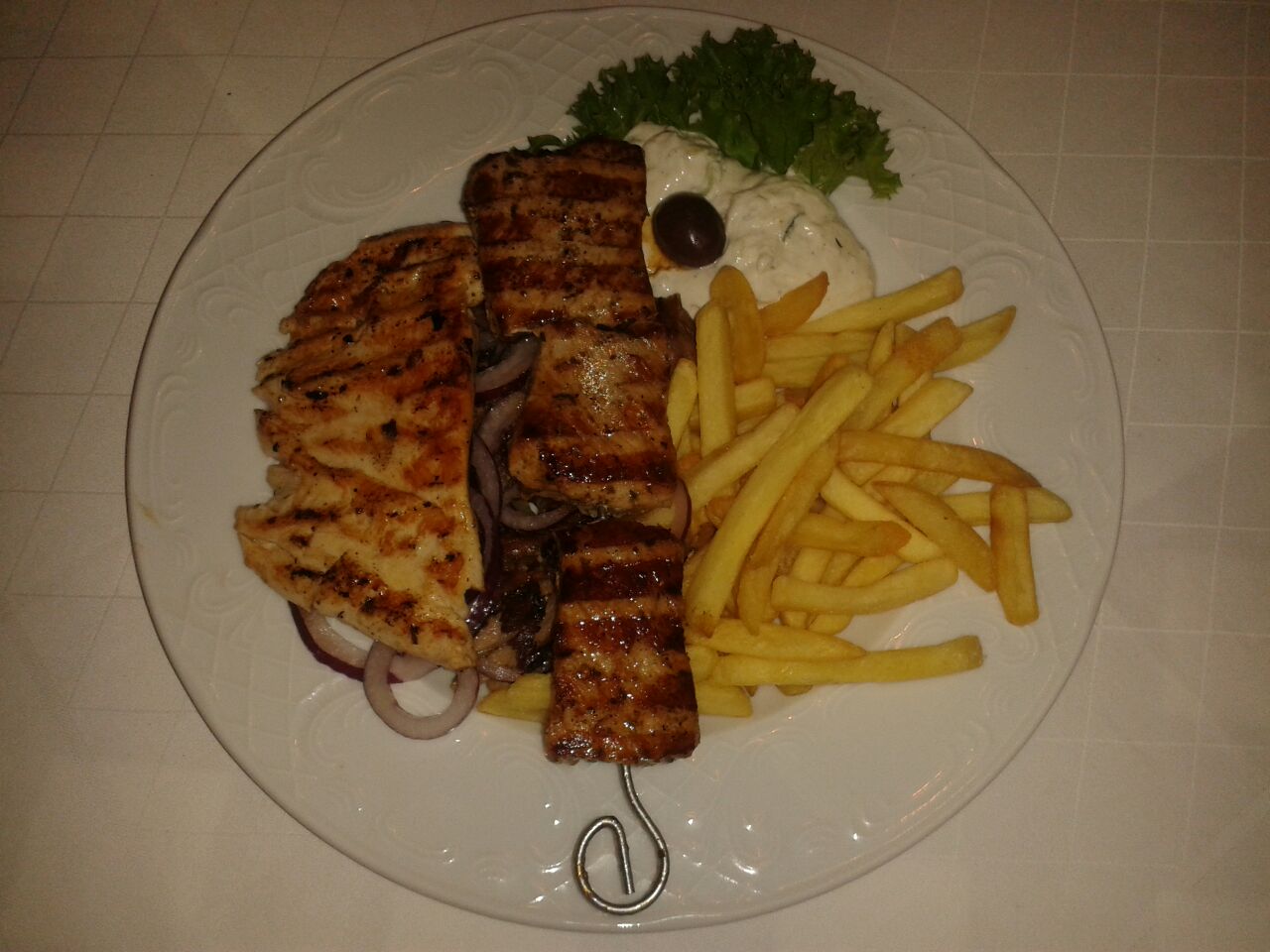 Gyros in Metaxasauce, mit Käse überbacken, mit Kartoffeln und Salat