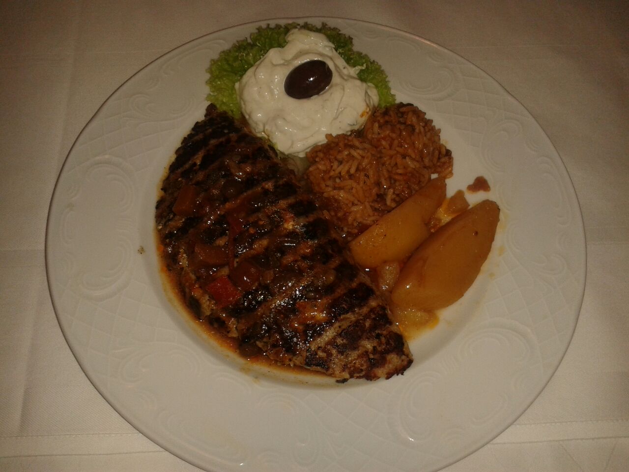 Gefüllte Hacksteak in Metaxasauce, mit Käse überbacken, mit Kartoffeln und Salat